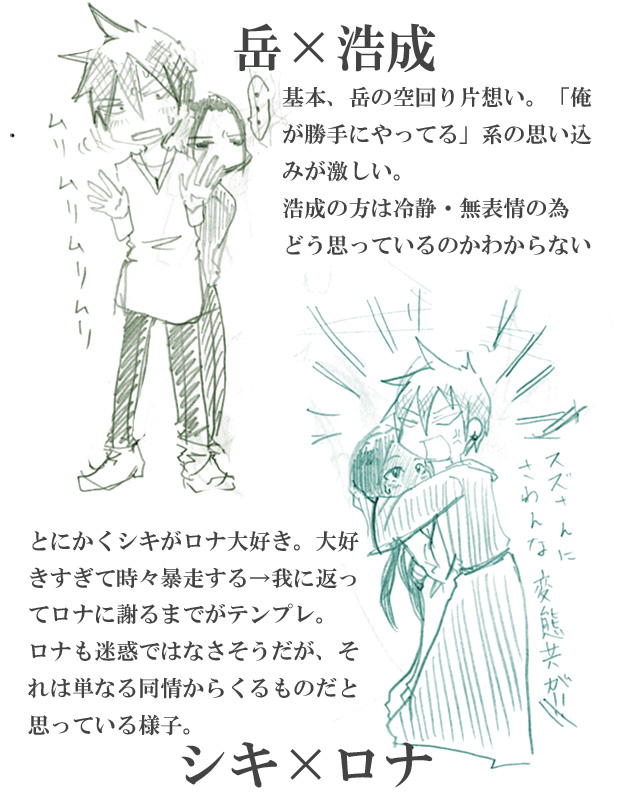 創作内CP:1 つぶやく 2015年09月07日 0 色澤 岳(シキザワ タケル):シキ鈴丘 浩也(スズオカ ヒロナリ):スズ・ロナニハハ(ロナ)異なる世界での同一人物。色澤と鈴丘は現代ファンタジーの相棒。シキとロナは異世界ファンタジーでの旅人。